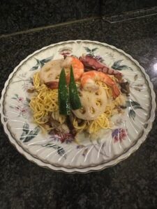 酢飯を作りちりめんじゃこ、椎茸、レンコン、たけのこ、にんじん全てみじん切りにしてエビは湯引きして三倍酢に漬け込み錦糸卵で飾りました。